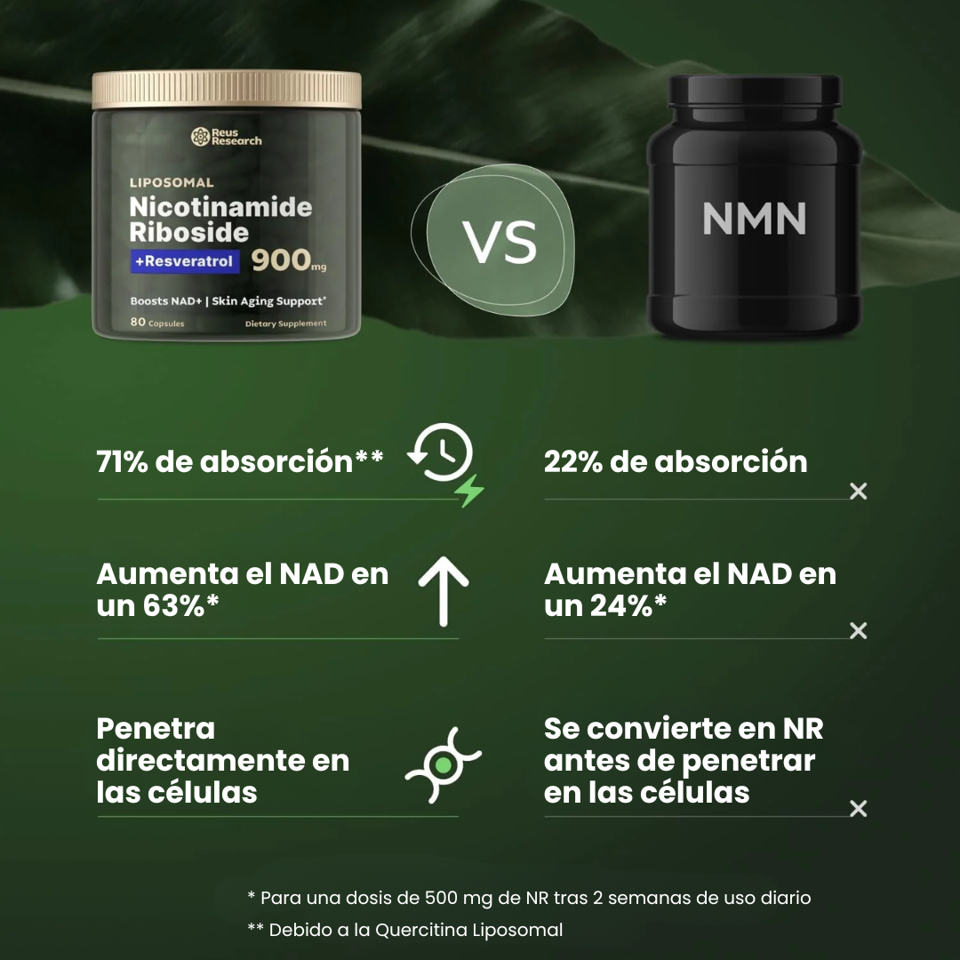 Reus Research NR900, con su avanzada fórmula, aumenta los niveles de NAD+ hasta un 60% en 8 horas, potenciando la energía celular, mejorando la concentración y reduciendo los signos del envejecimiento desde la primera dosis.